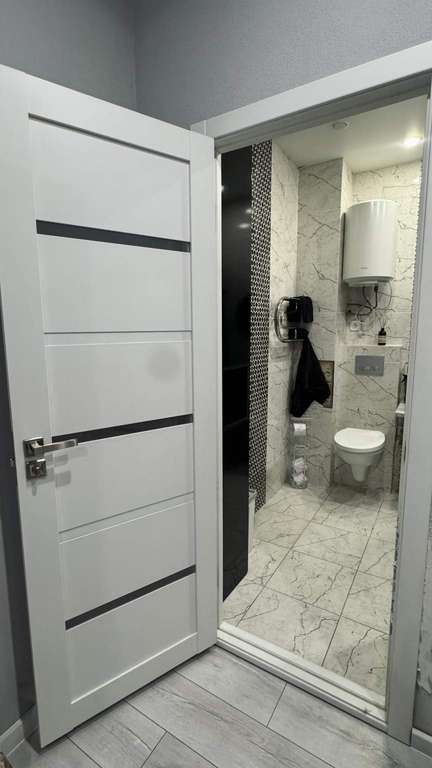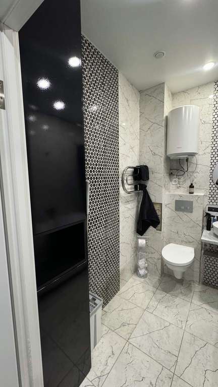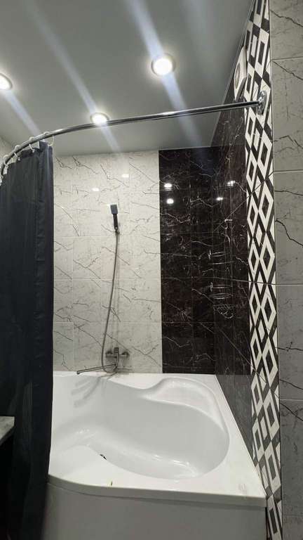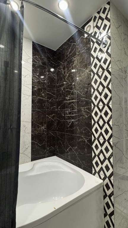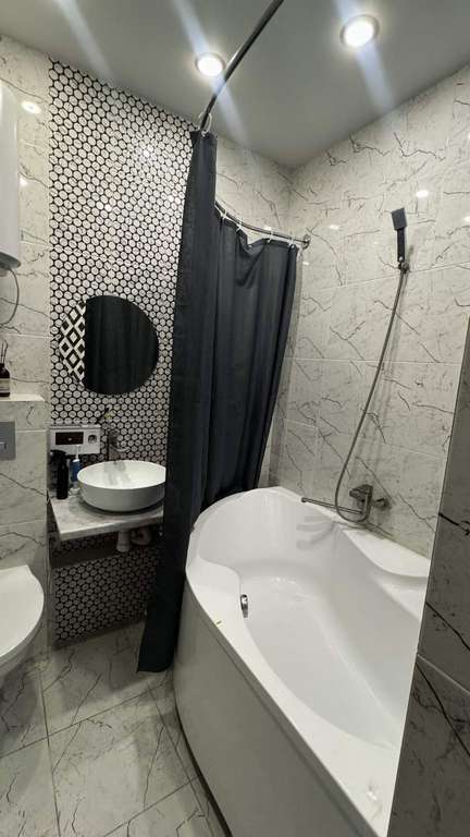 Санузел: Совмещенная ванная комната, качественная плитка, удобная угловая ванна и вместительный пенал для хранения.